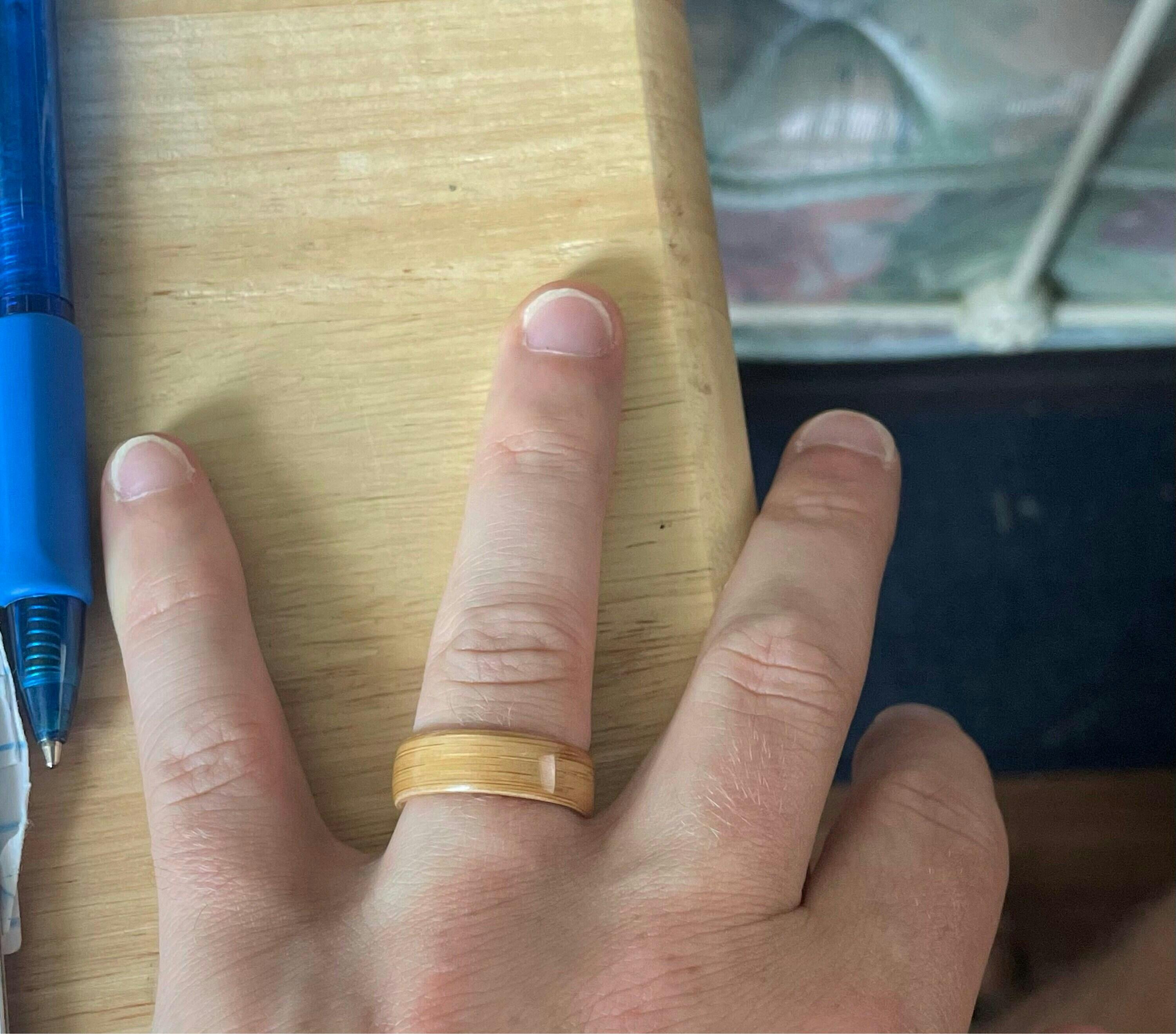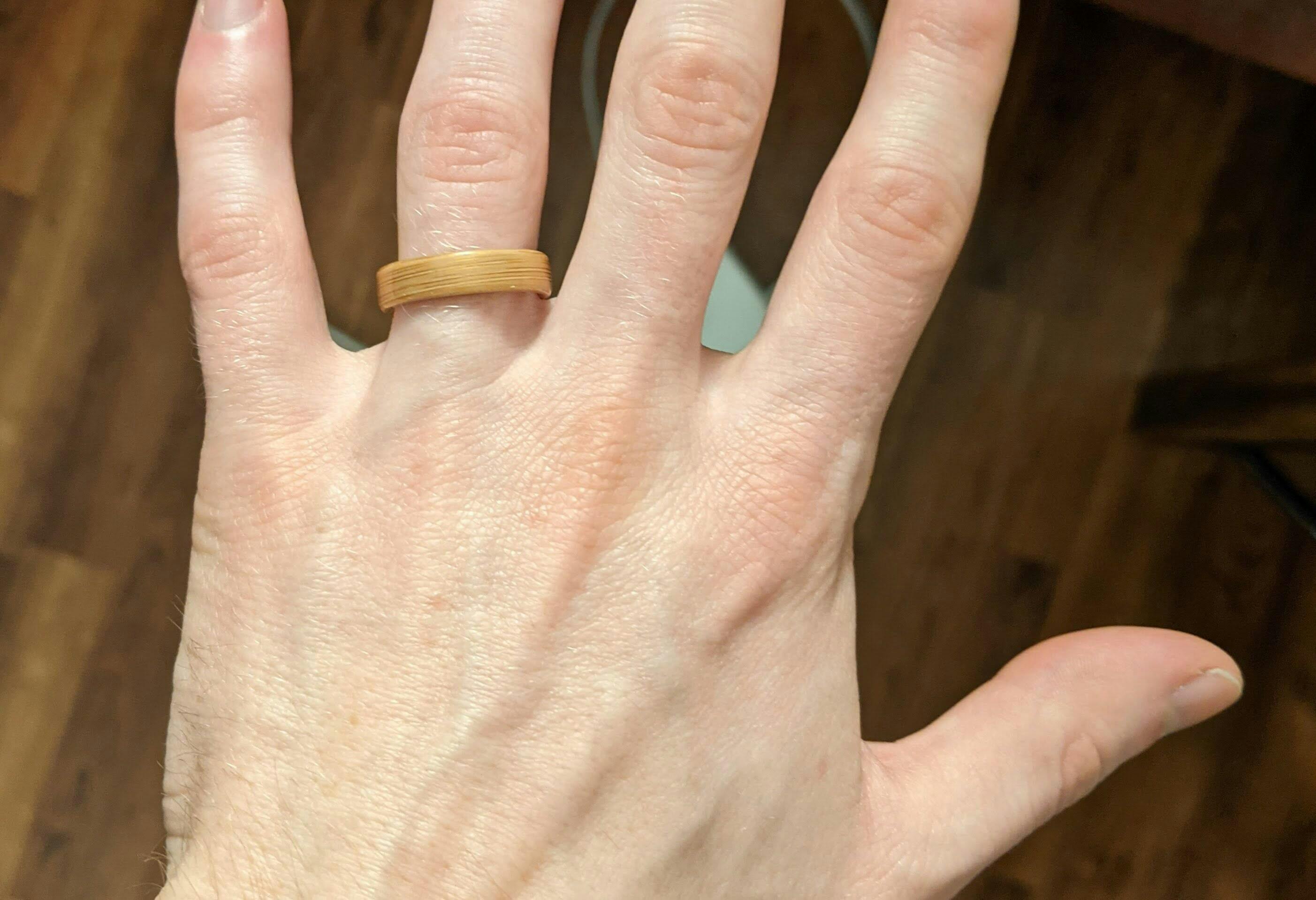 I really love this ring! It is very nice looking, with a pretty grain, and it's thin and light. It fits just to what was requested (and Matthew even allowed me to pick a US size over chat).