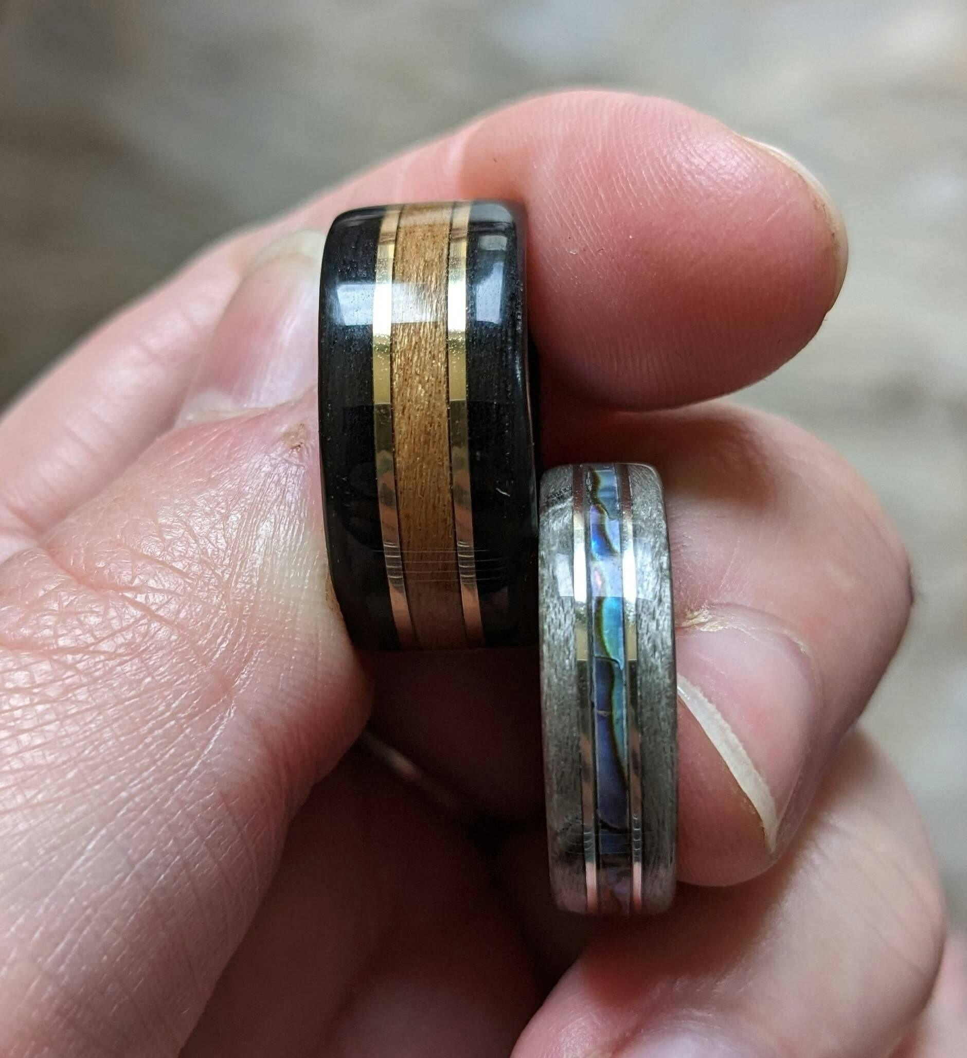 Custom wood, metal & abalone shell hand made bent wood ring