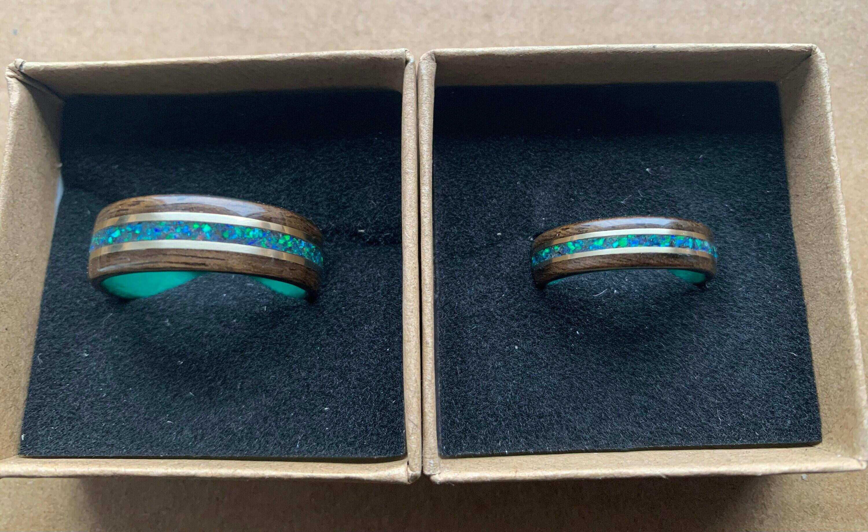 Custom wood, metal, & crushed opal hand made bent wood ring